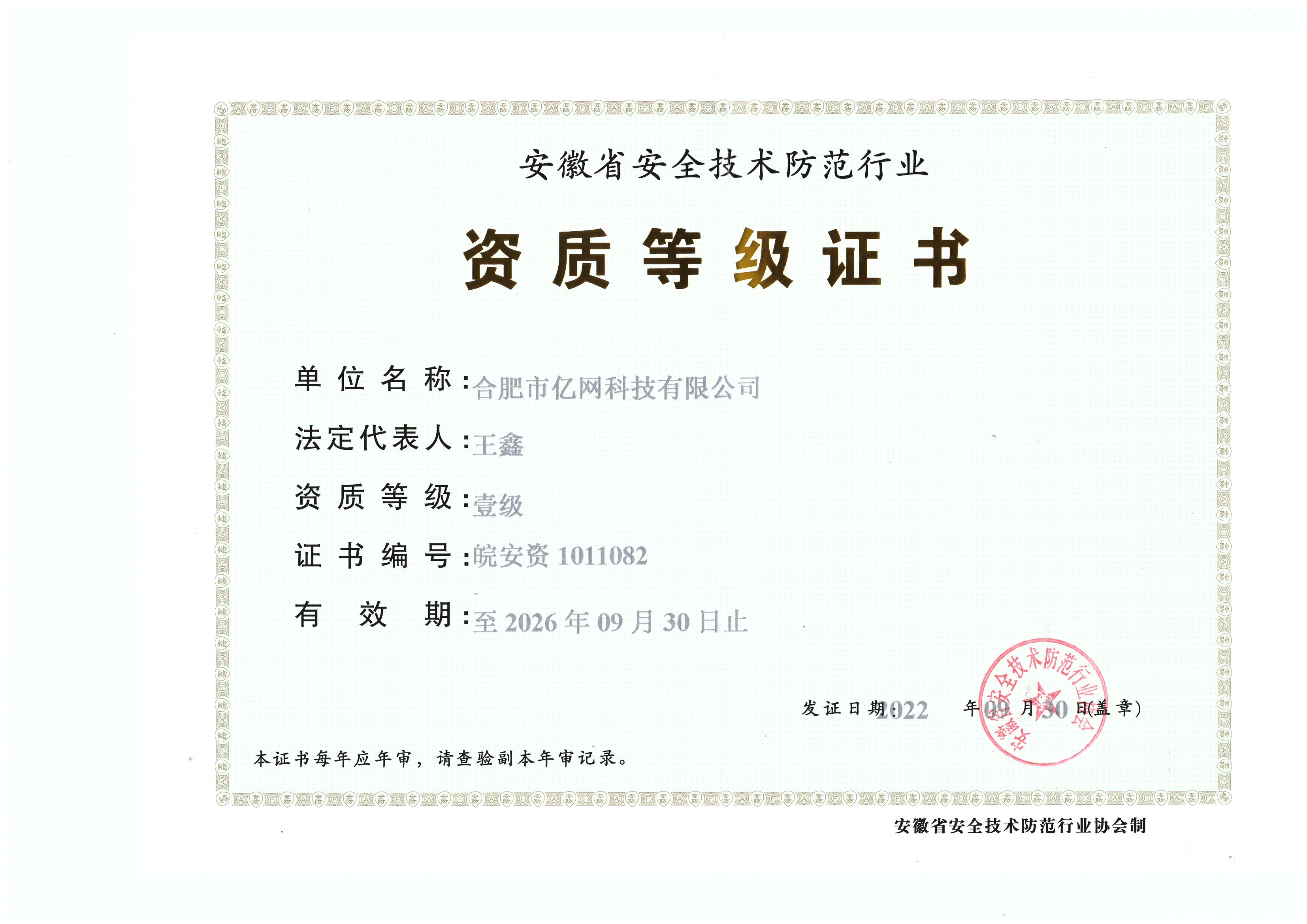 安徽省安全技術(shù)防范資質(zhì)等級證書