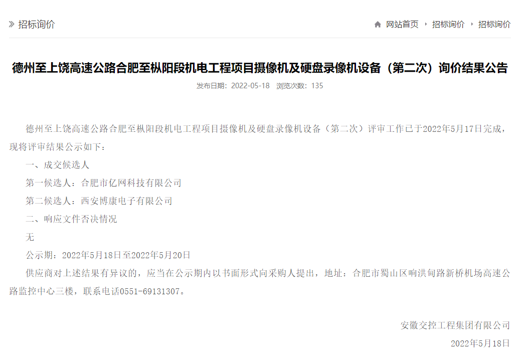 5月18日,再傳捷報,合肥市億網(wǎng)科技有限公司在眾多的競爭者中經(jīng)過公司各部門相關(guān)人員團(tuán)結(jié)一致、齊心努力,憑借過硬的技術(shù)實(shí)力、良好的信譽(yù)和豐富的項目經(jīng)驗(yàn)贏得了業(yè)主和評標(biāo)委員會的肯定,我公司在競標(biāo)中兩次擊敗競爭對手,最終中得安徽交控工程集團(tuán)有限公司《德州至上饒高速公路合肥至樅陽段機(jī)電工程項目》。